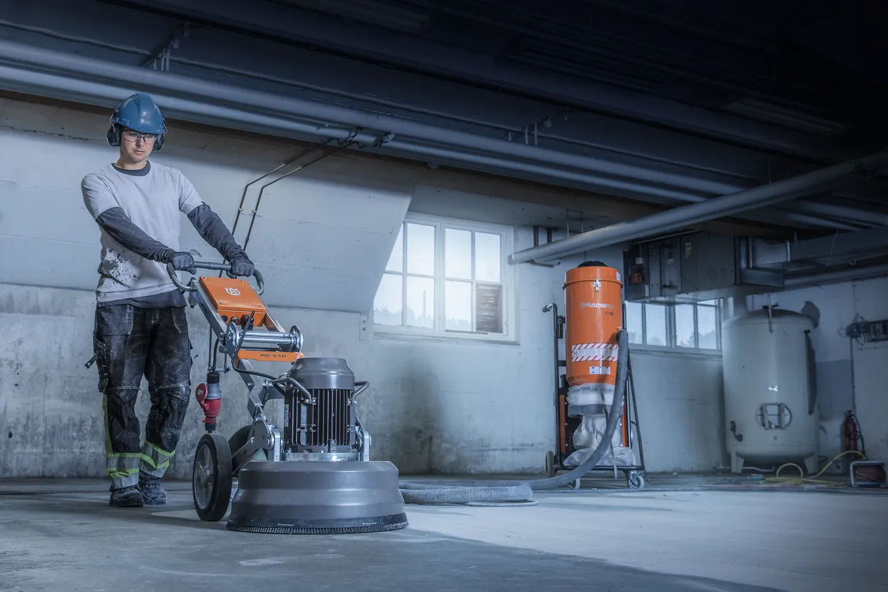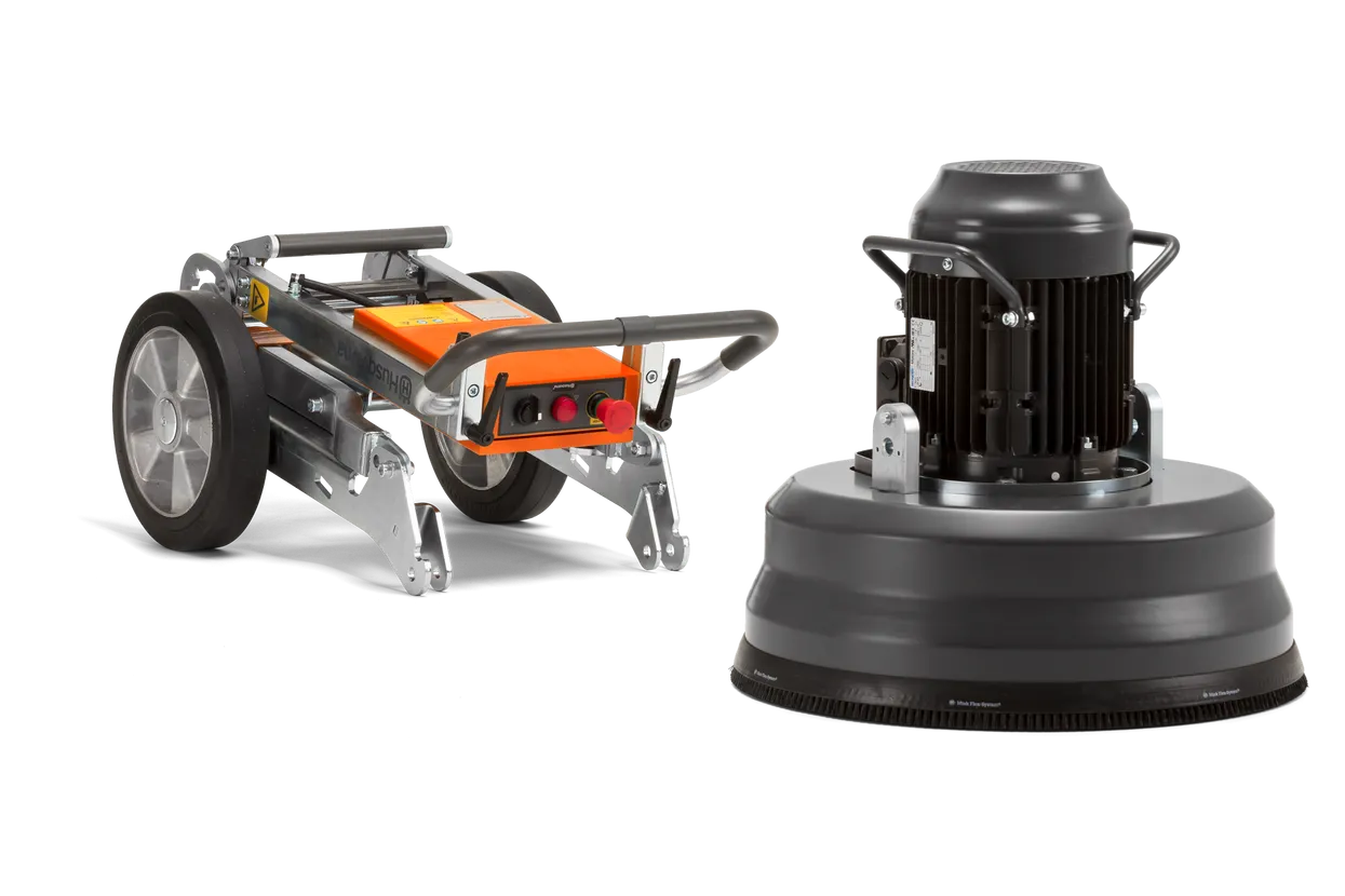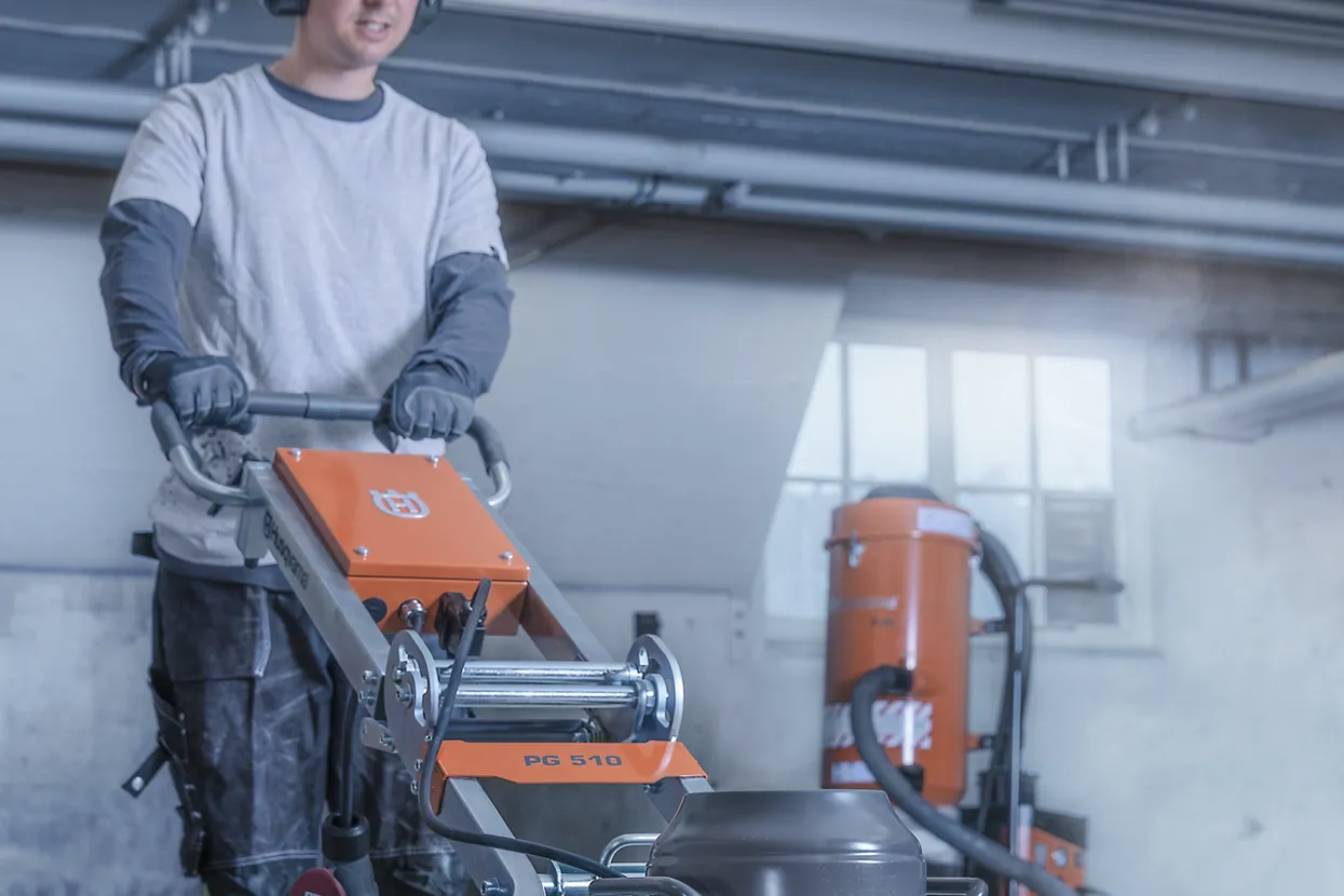 The PG 510 is a planetary floor grinder with three grinding discs and a total grinding width of 515 mm. It is suitable for removing coatings, grinding and polishing concrete, etc. The grinding head on the PG 510 is effectively sealed to keep dust and moisture out. This greatly extends the lifetime of the bearings and belts. The PG 510 is ideal as a rental machine and suitable for both professional and semi-professional work. Quick-release couplings allow the grinding head to be separated from the chassis which can then be easily folded for transport. The grinder also has a digital hour meter.